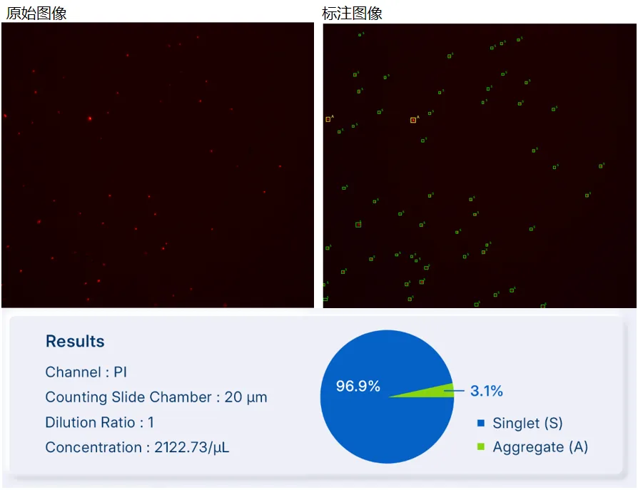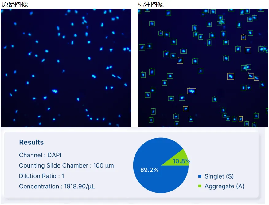 在以下案例中,实验人员对一份肺癌 FFPE 组织来源的细胞核悬液进行 DAPI 染色,并使用 VITAscout 进行质控评估。依托高分辨率成像系统,VITAscout 稳定识别细胞核并自动计算其浓度为1,918.90/μL,在样本体积为 100 μL 的情况下,总细胞核数为 191,890,结团率为 10.8%。根据后续实验所需的最低质量标准(细胞核数 ≥50,000,结团率 <20%),该样本满足质控要求,可继续进入后续实验流程。上述定量结果为样本判定提供了清晰、客观的依据。